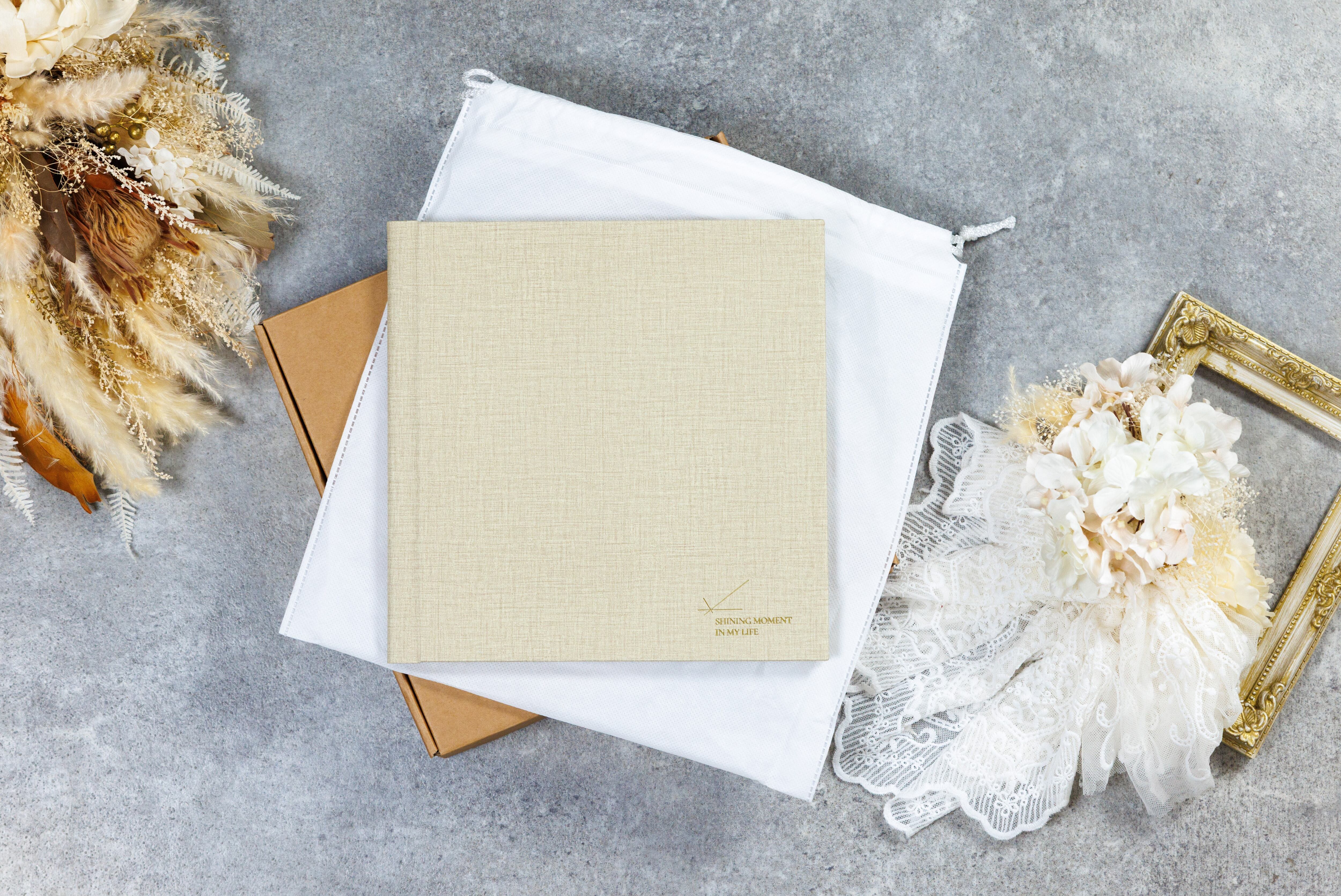 コットン生地のシンプルな表紙、パステルクラフト色の玉紐ケースも可愛らしさを演出し、プラスワン商品に最適です。